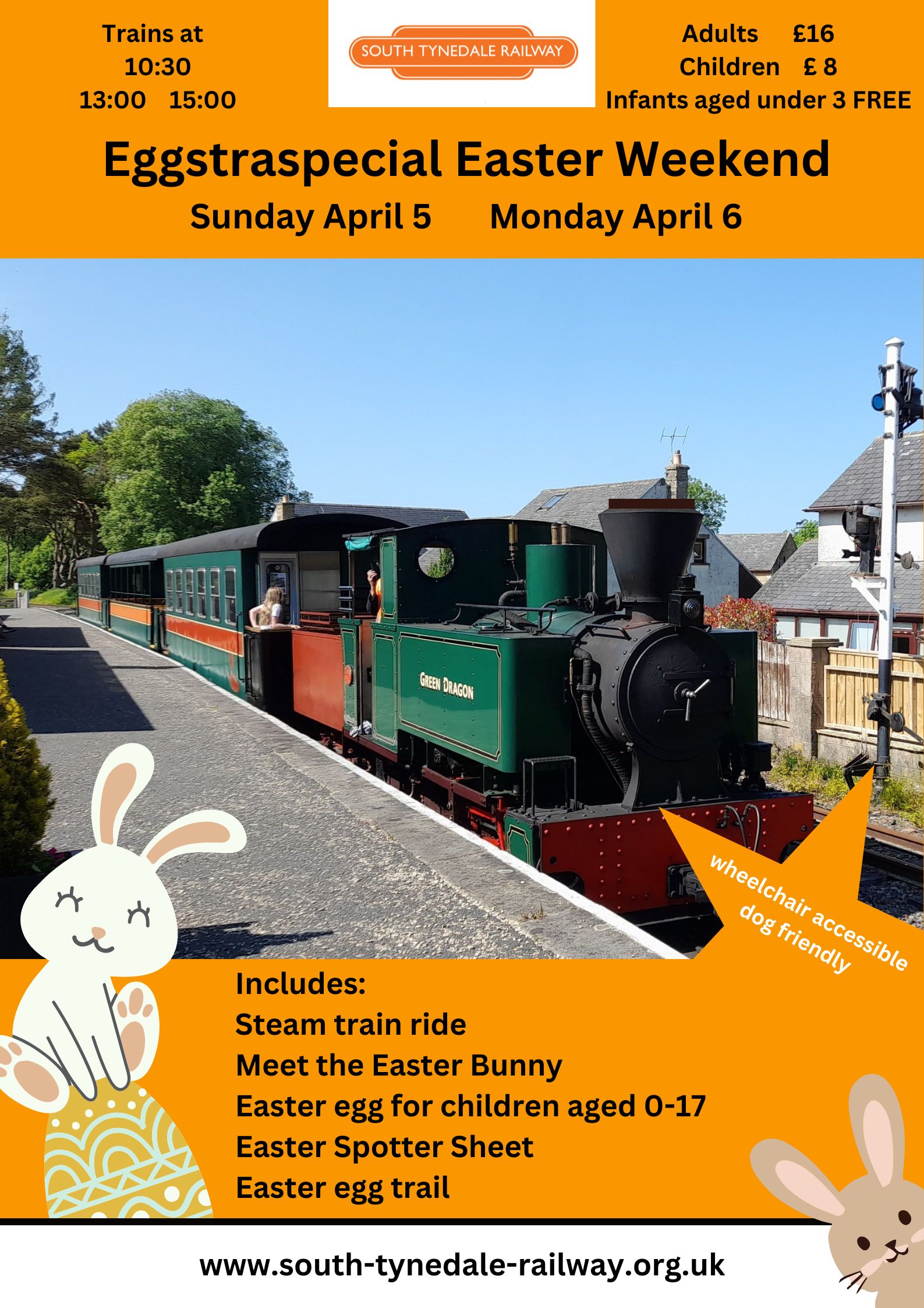 Come for a steam train ride through the picturesque South Tyne valley, and, as it’s Easter Sunday, the Easter Bunny will be visiting us with some chocolate treats for all children aged 0-17!
