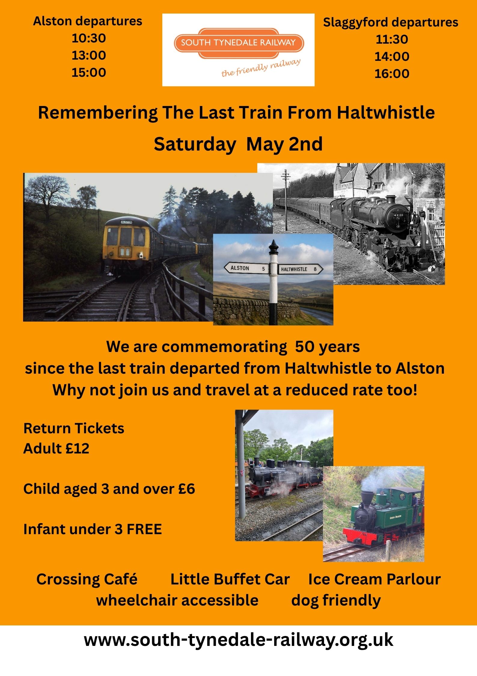 Tickets for members of the Heritage Railway Association, Rail Riders or STRPS members may be obtained from the ticket office, on the day of travel. ALSTON DEPART 10:30 13:00 15:00 KIRKHAUGH 10:45 13:15 15:15 LINTLEY 10:53 13:23 15:23 SLAGGYFORD ARRIVE 11:05 13:35 15:35 SLAGGYFORD DEPART 11:30 14:00 16:00 LINTLEY 11:42 14:12 16:12 KIRKHAUGH 11:50 14:20…