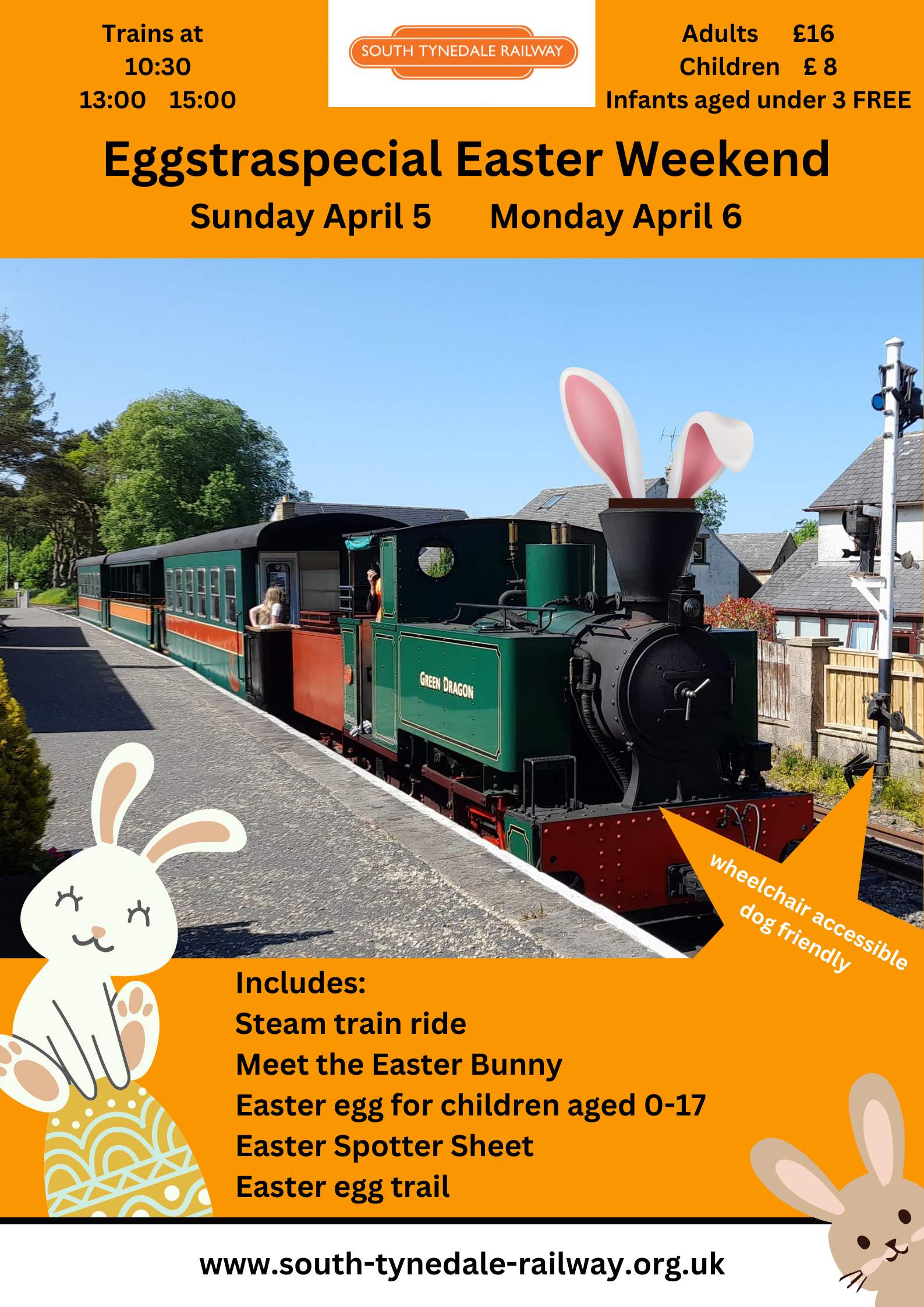 Easter Eggstravaganza Choo-Choo, the Easter Bunny is coming too! Come for a steam train ride through the picturesque South Tyne valley, and, as it's Easter Sunday, the Easter Bunny will be visiting us with some chocolate treats for all children aged 0-17! Your ticket includes: Return train travel from Alston to Slaggyford A visit from…
